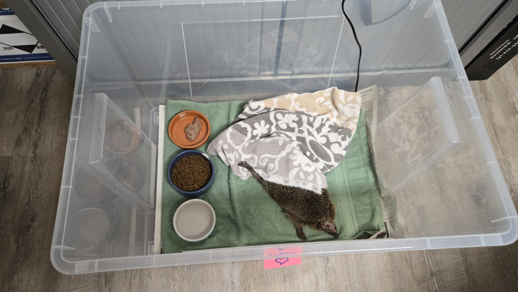 Das oben auf dem Foto ist Anton am 12.11.2025. Man sieht noch die Narben der Kopfverletzung durch einen Mähroboter. Er wird auch zum Überwintern bei uns bleiben. Noch darf er aber nicht in ein Außengehege umziehen, weil er auch noch ein nicht ganz verheiltes Abszess hat und eine Fußverletzung. Aber er findet sein Leben in der Päppelbox nicht wirklich schlimm – wie man sieht. Da seine innere Uhr im allerdings schon suggeriert, dass es Zeit für den Winterschlaf ist, hat er eine Heizmatte bekommen, (die ihm sommerliche Temperaturen vorgaukelt), auf der er immer lang ausgestreckt liegt.