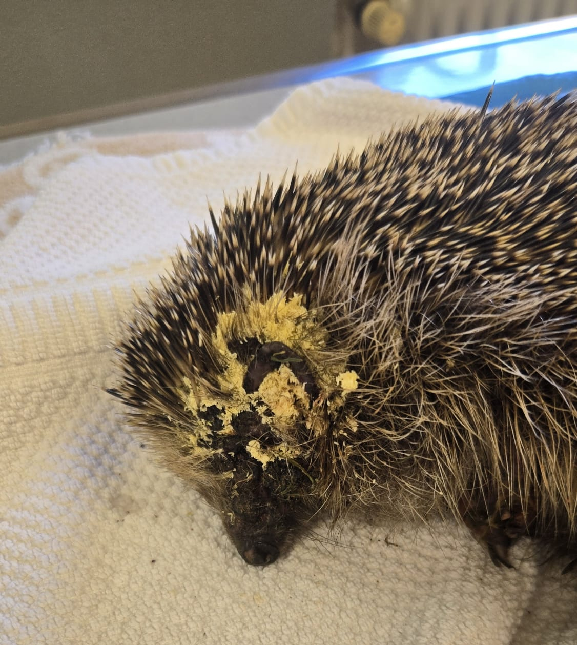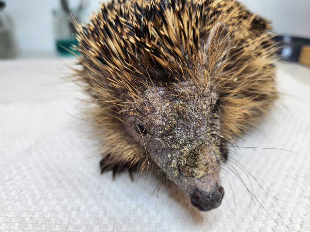 Das oben auf dem Foto ist Maximus. So sah er aus, als er am 02. September 2024 zu mir kam. Mag sein, dass es Igelfachkundige gibt, die mit blossem Auge erkennen können, ob es sich dabei um einen Pilz oder Milben oder beides handelt. Ich kann das nicht. Und da Laboruntersuchungen in solchen Fällen erstens sehr lange dauern, weil zuerst eine Kultur angelegt werden muss, zweitens sehr teuer sind und drittens oftmals ohne spezifischen Befund zurückkommen, behandele ich so etwas nach dem Ausschlussverfahren.