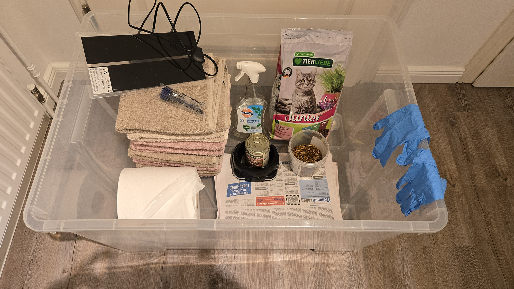 Ich verwende dazu Sagrotan Desinfektionsreiniger Spray, 500ml Sprühflasche, Preis ca. 3 Euro. (Beim Discounter gibt es auch günstigere Marken, aber die haben den Nachteil, dass sie alle sehr stark schäumen, was ich persönlich nicht mag.) Und dann benötigen Sie Küchenrolle zum auswischen/trocken wischen der Box.